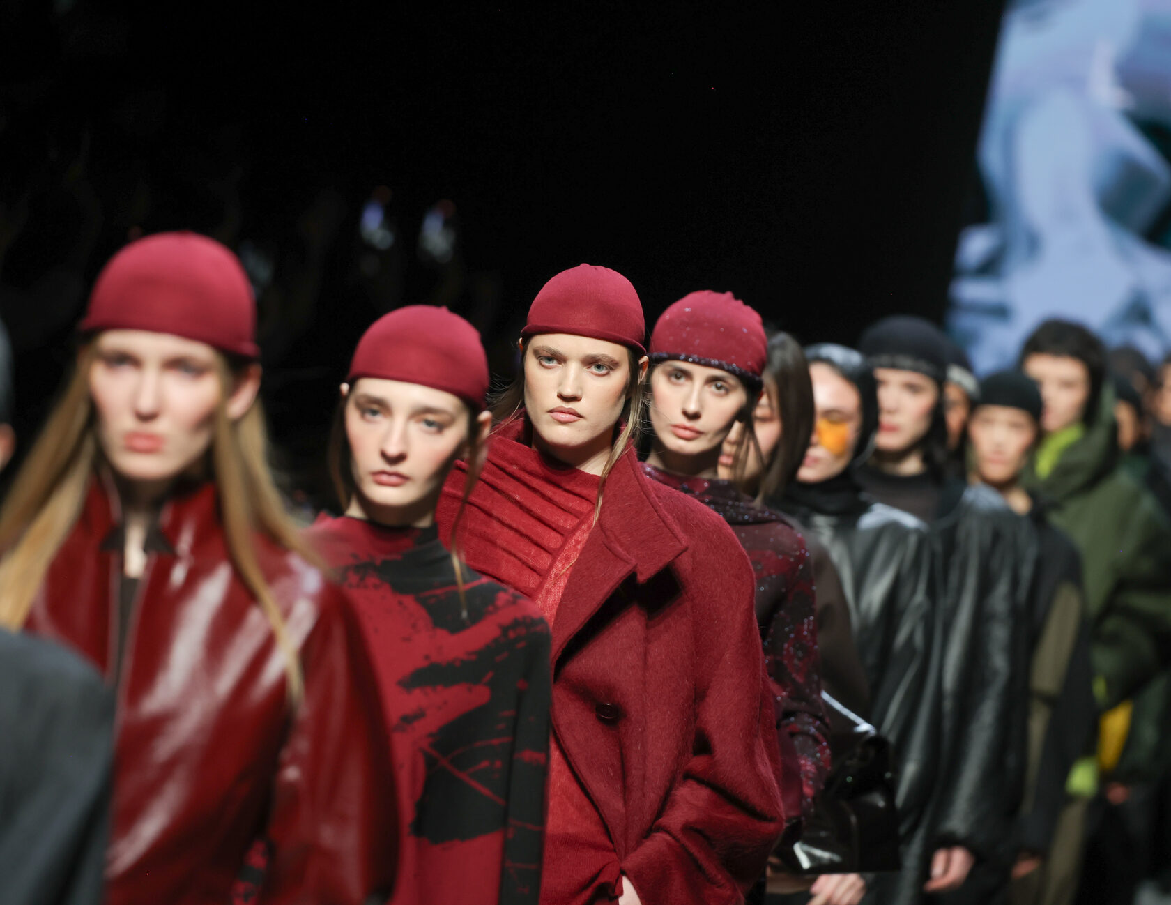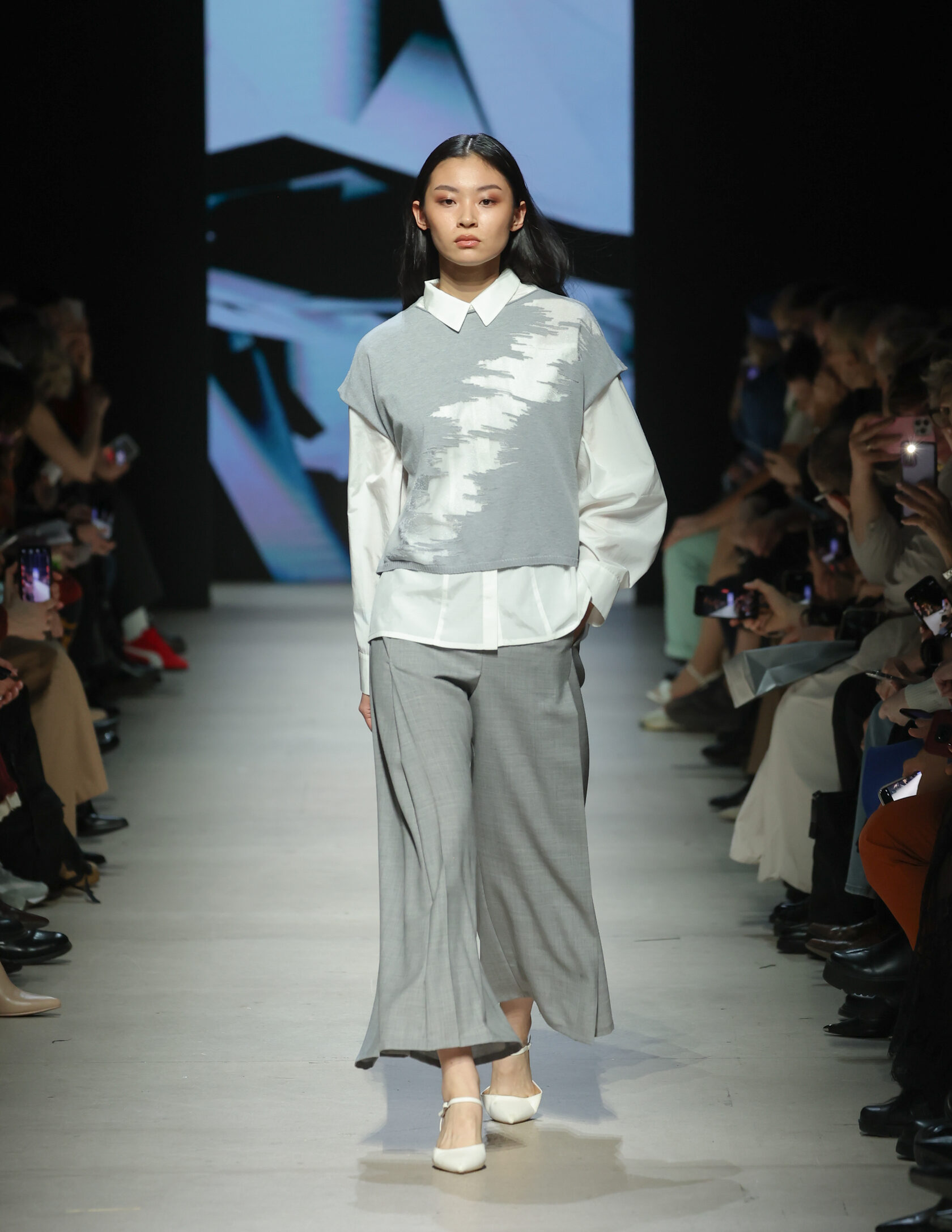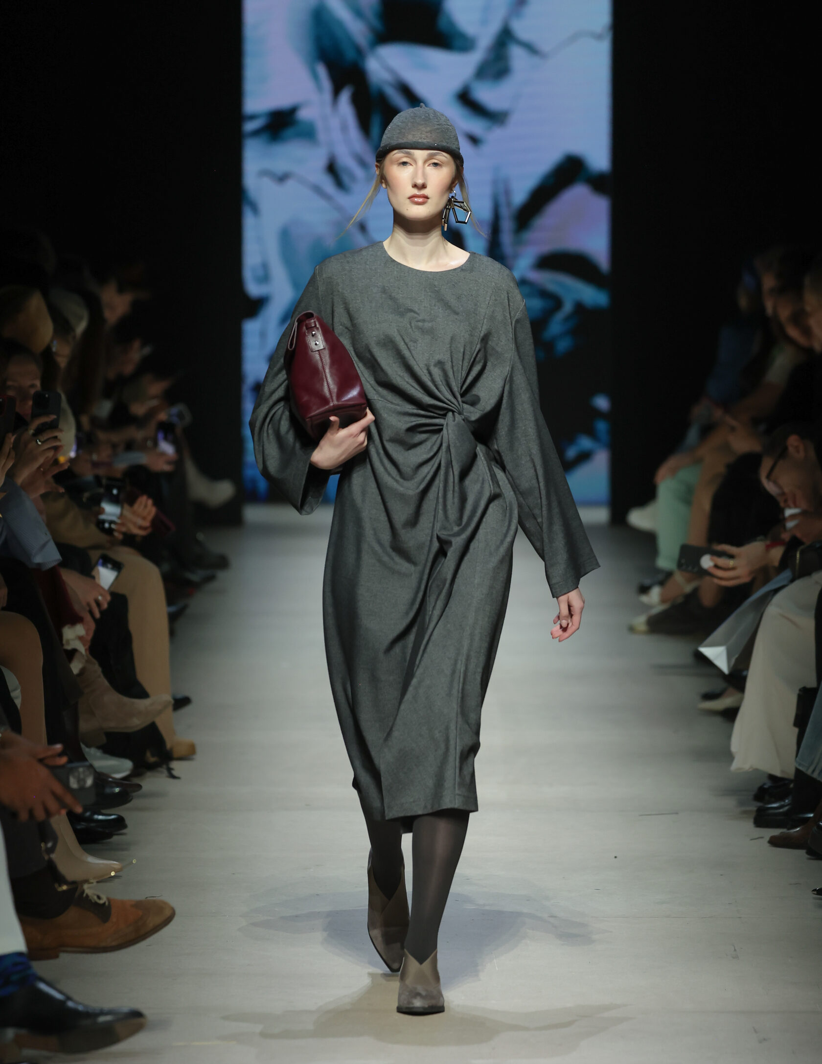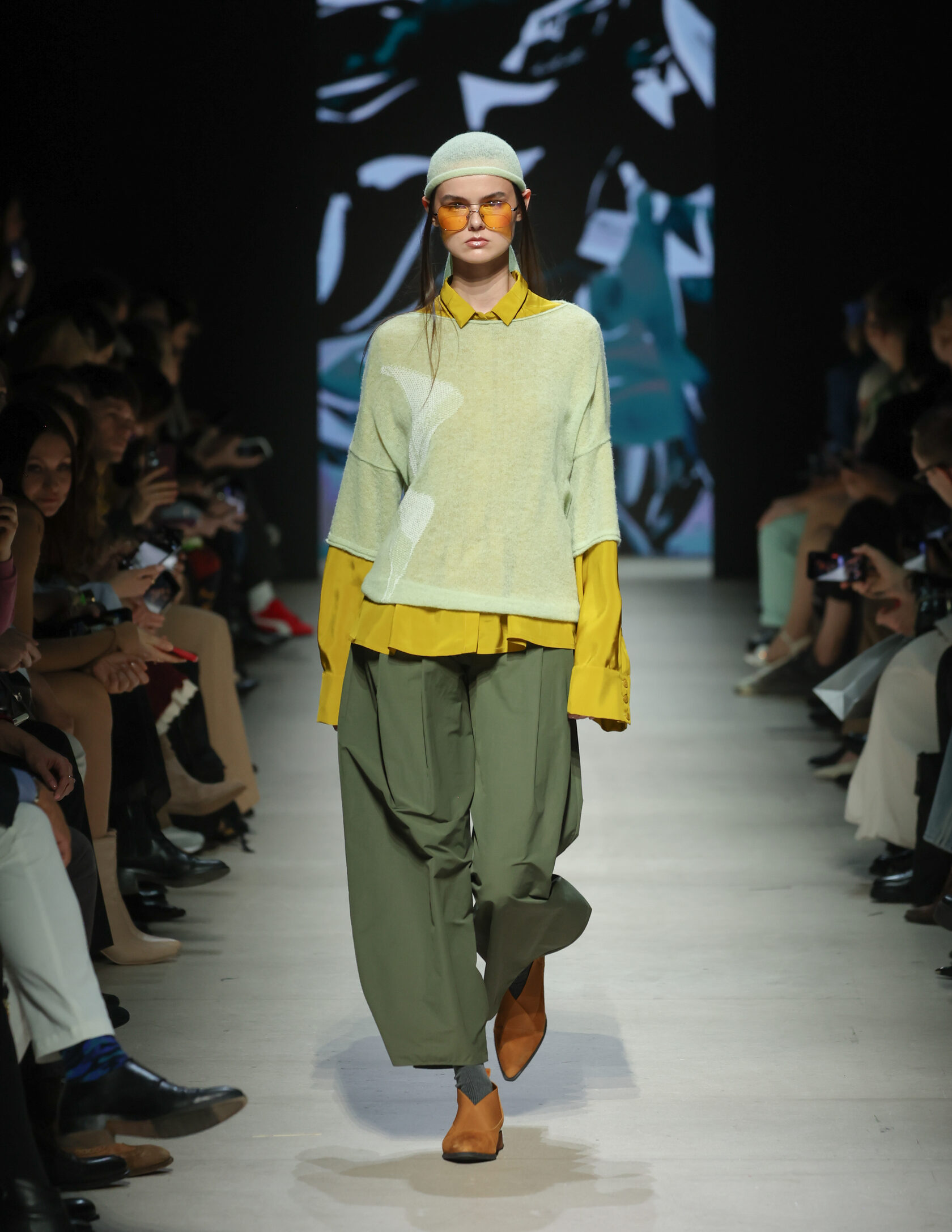 Концепция нашей новой коллекции проявляется через заимствование природных биоморфных форм — дутые объемные бомберы и парки соседствуют с изысканными платьями с асимметричными узлами, стеганые особым способом куртки взаимодействуют с гладкой поверхностью костюмной шерсти, а волнистые линии отлетных кокеток «танцуют» с монолитными формами брюк и юбок.