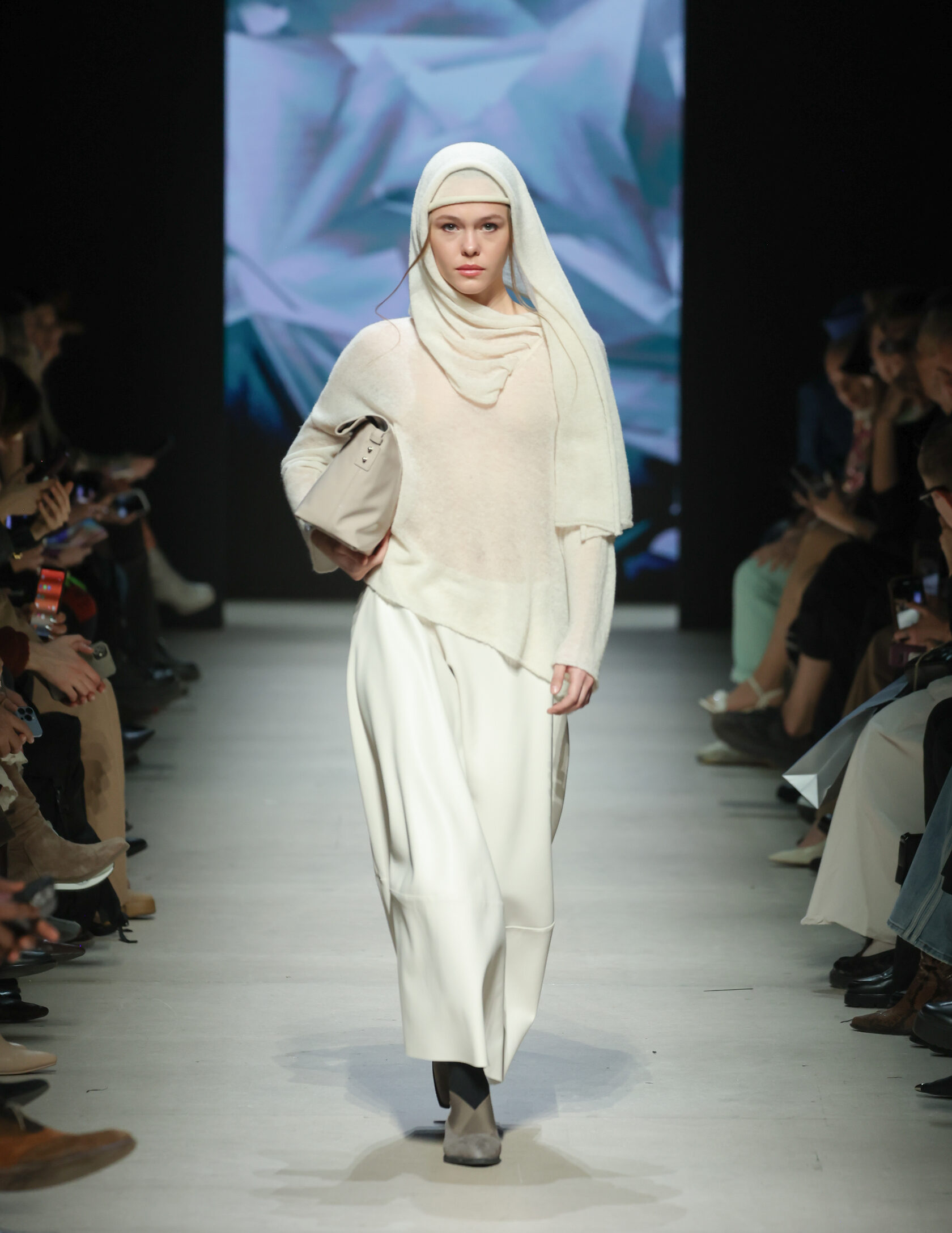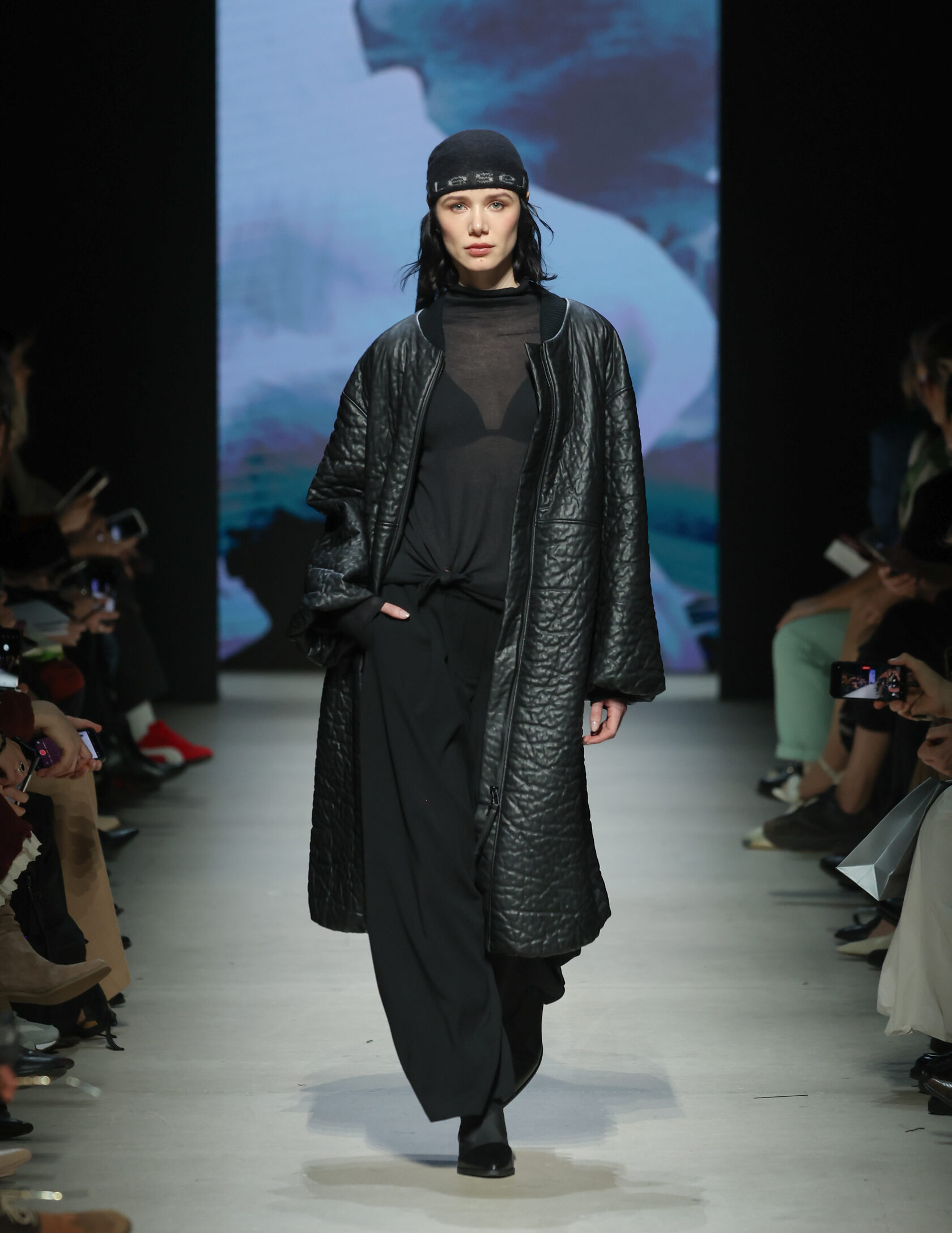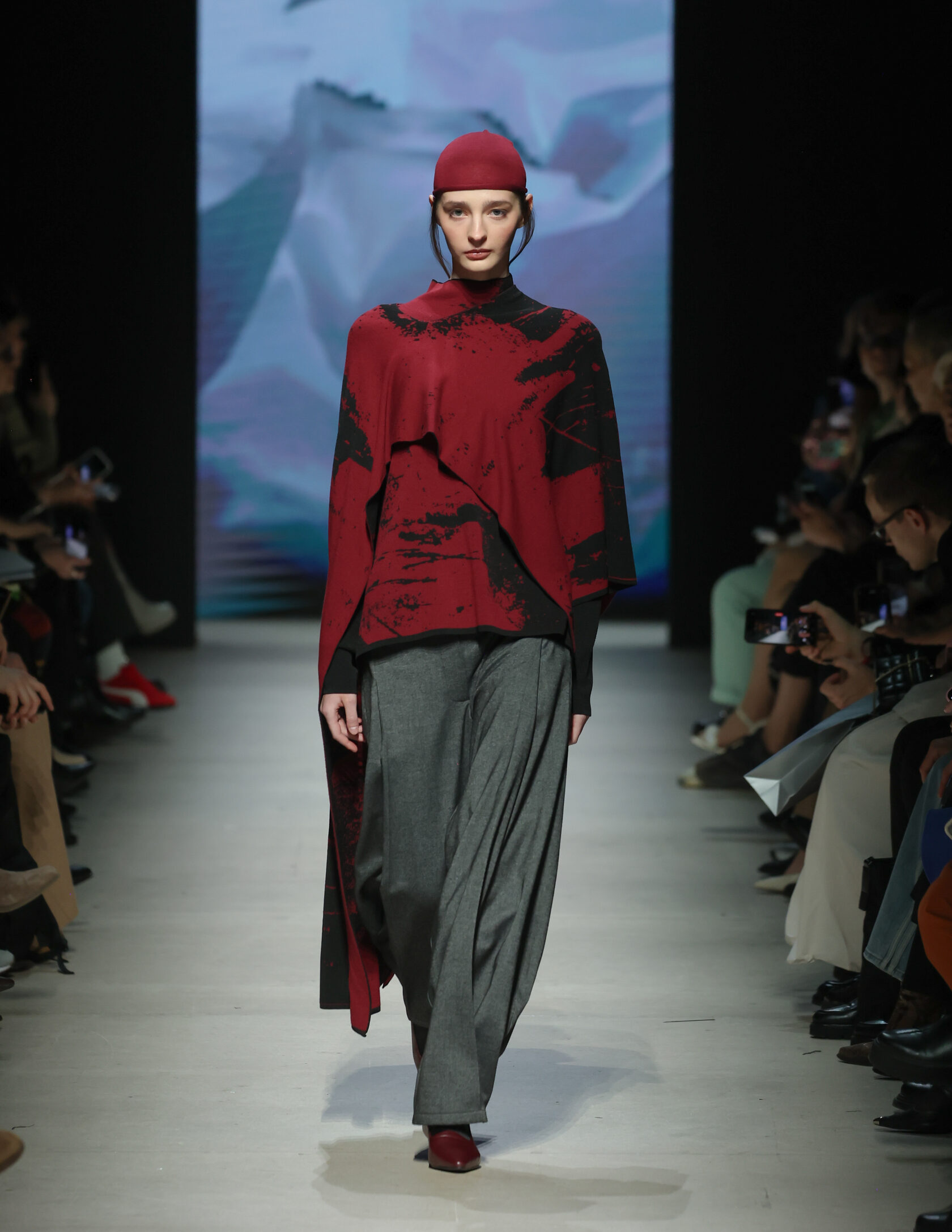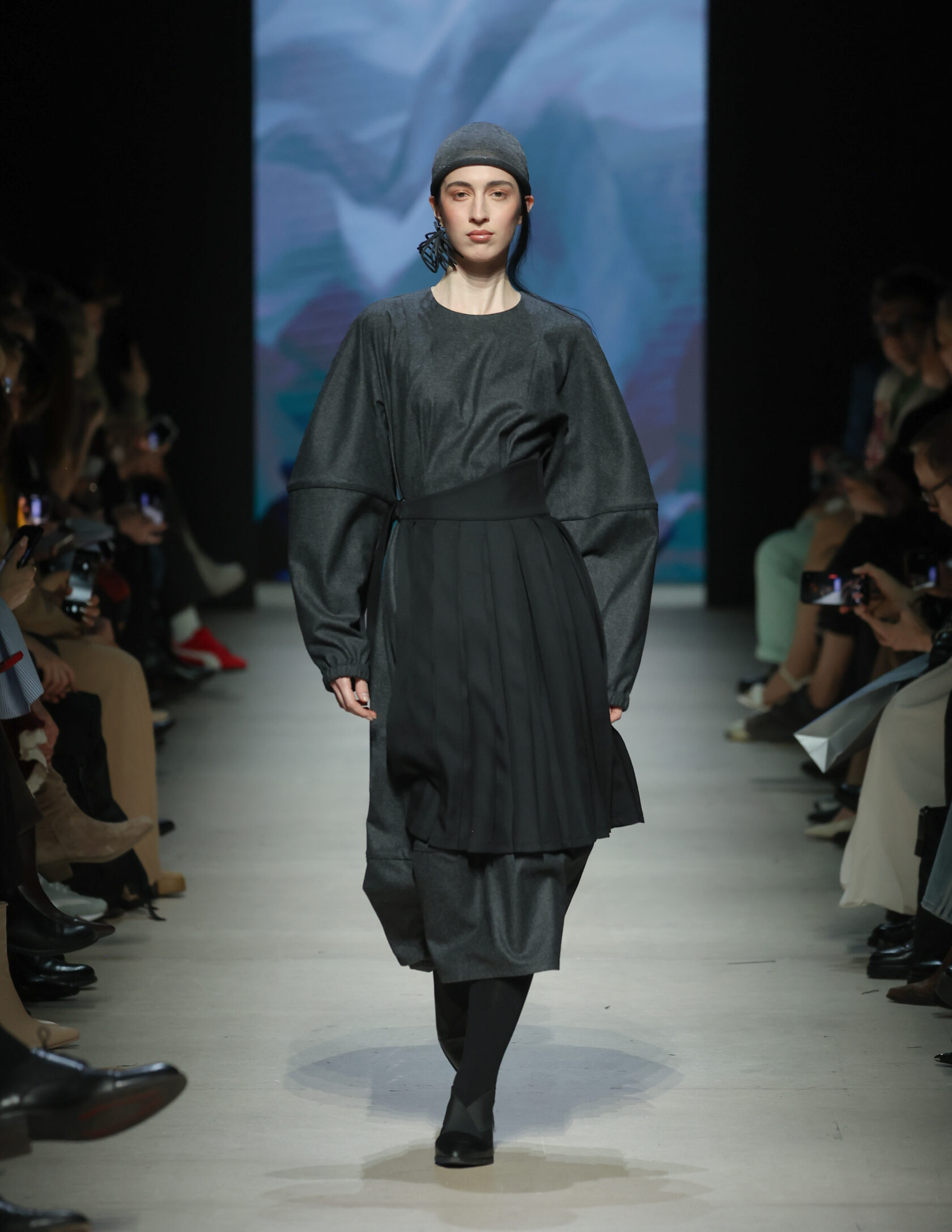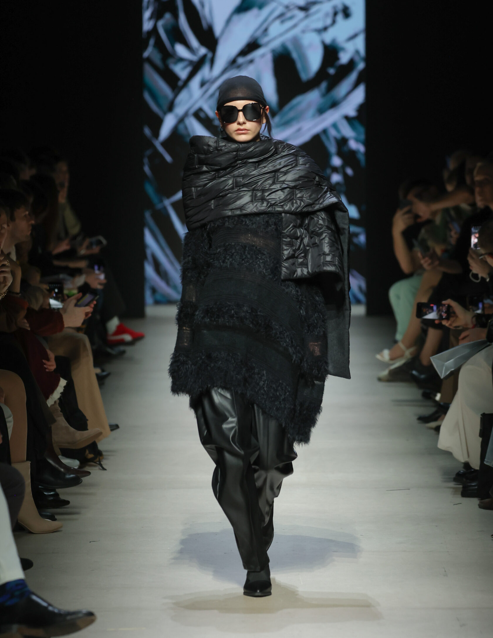 Богатые фактурные ткани и сложный фантазийный трикотаж — материальная основа коллекции. Игра объемов и плавных форм — ее наполнение. Защита и ощущение безопасности для женщины — функция. Гармония — ее душа.