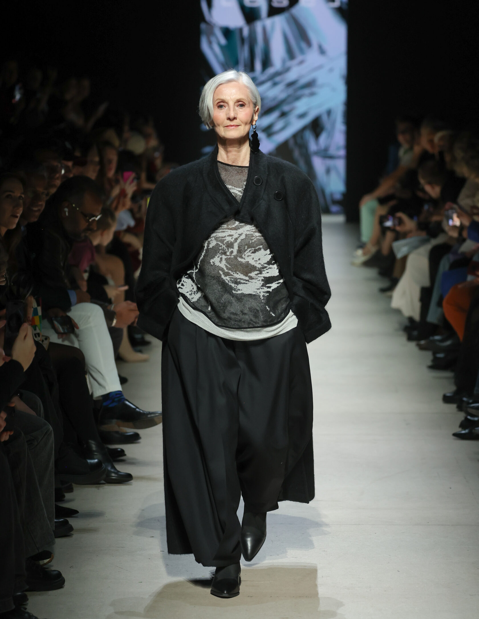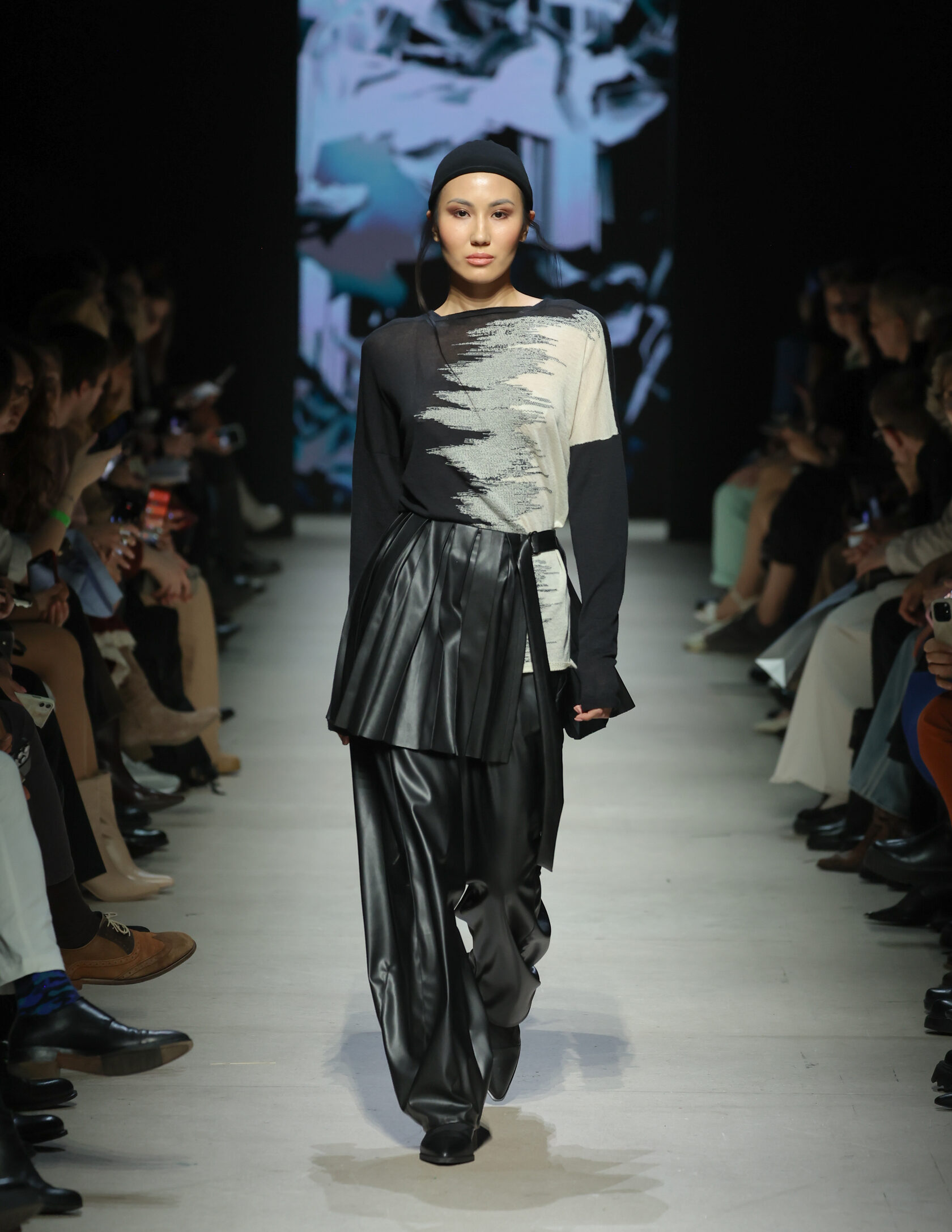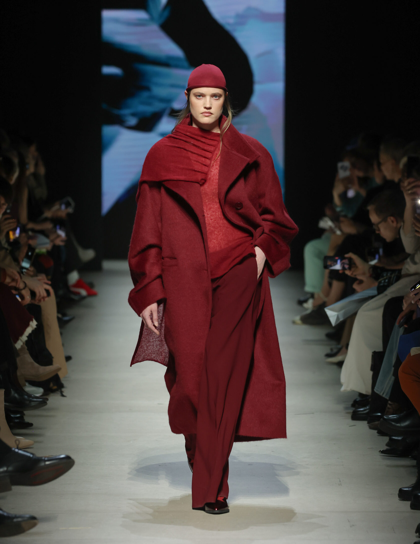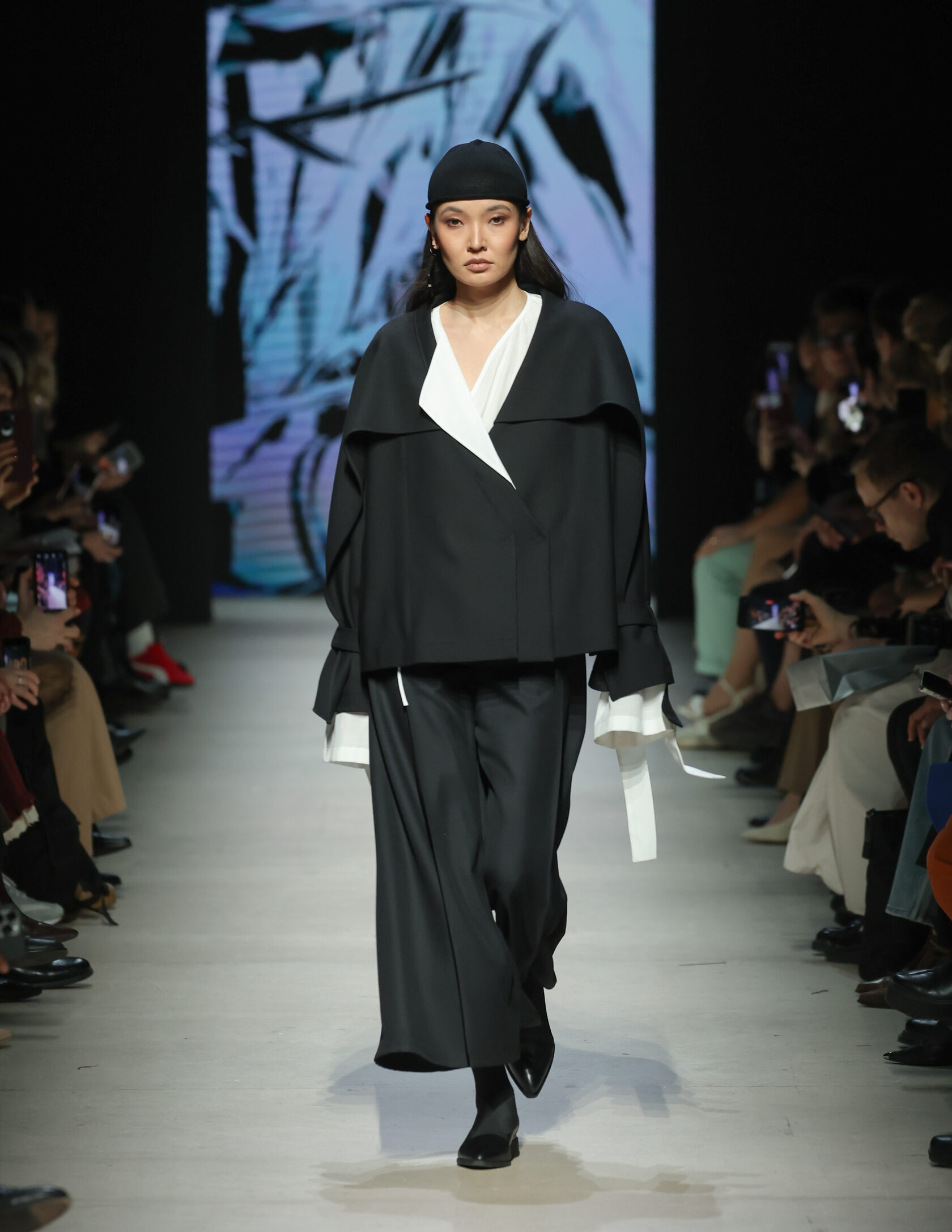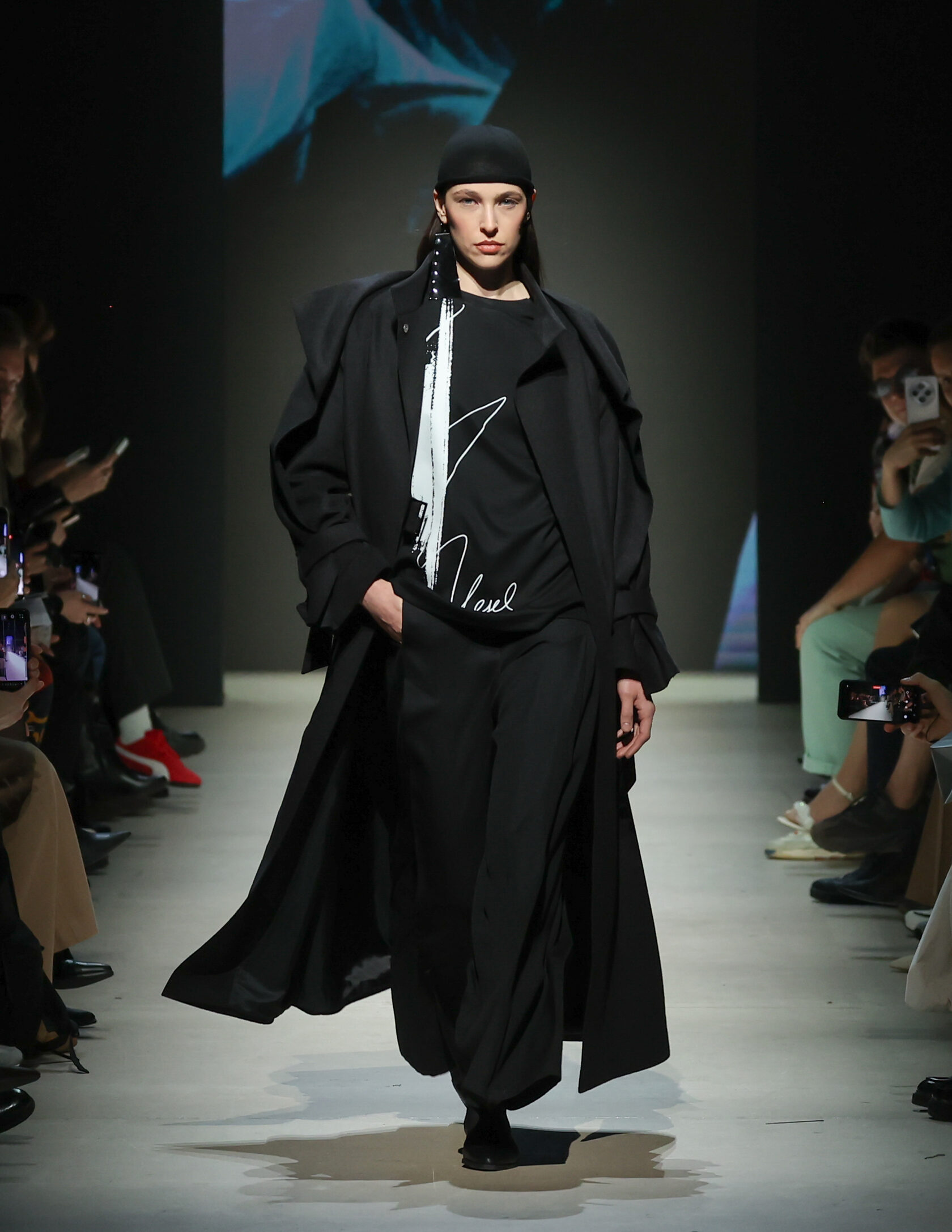 Богатые фактурные ткани и сложный фантазийный трикотаж — материальная основа коллекции. Игра объемов и плавных форм — ее наполнение. Защита и ощущение безопасности для женщины — функция. Гармония — ее душа.