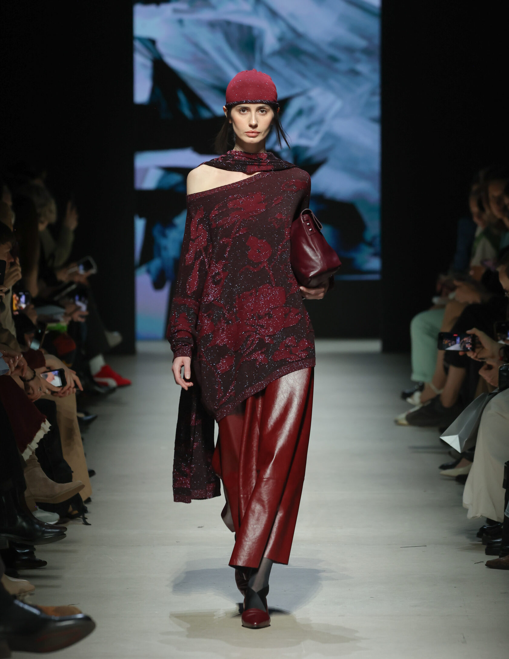 Диагональные воланы на брюках и волнистые пелерины словно окутывают изделия из ткани и трикотаж с плавными рисунками, а гладкая или бугристая, как сама земля, кожа соприкасается с мохнатой пряжей джемперов…