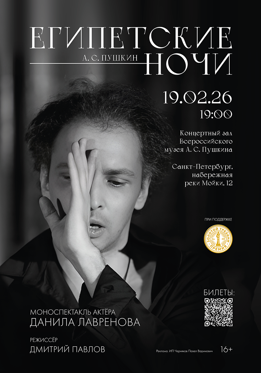 19 февраля 2026 года в концертном зале Мемориального музея-квартиры А. С. Пушкина в Санкт-Петербурге впервые состоится показ моноспектакля «Египетские ночи».