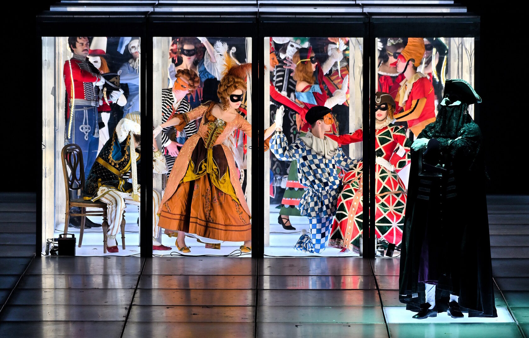 Хронология произведения охватывает почти век русской истории: от последней театральной премьеры Российской империи – драмы М. Ю. Лермонтова «Маскарад», поставленной в дни Февральской революции на сцене Александринского театра знаменитым режиссером Вс. Мейерхольдом, до 2014 года, когда на сцене того же Александринского театра состоялась премьера спектакля «Маскарад. Воспоминания будущего» в постановке Валерия Фокина (по драме Лермонтова и одноименному спектаклю Мейерхольда).